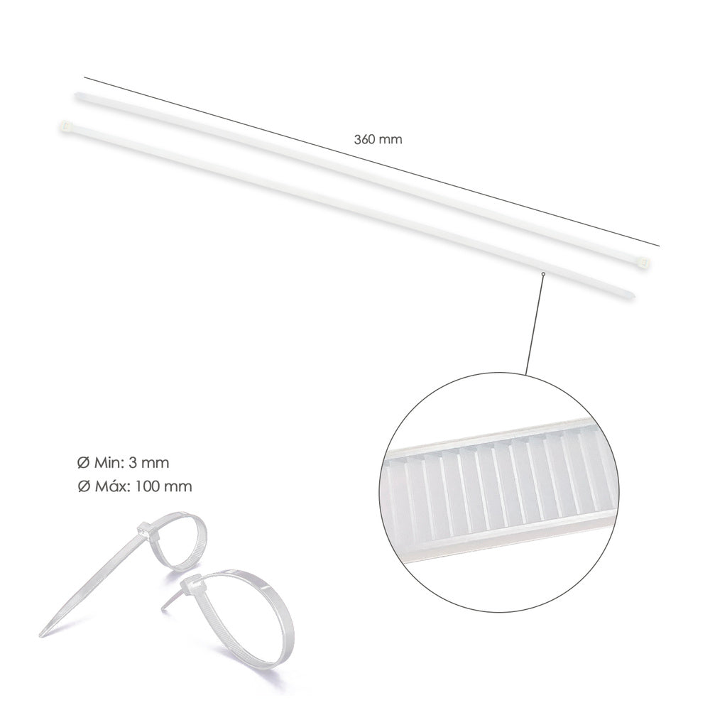 Brida nylon 100%. color blanco / natural 4,5 x 360 mm. 100 piezas. abrazadera plástico, organizador cables, alta resistencia