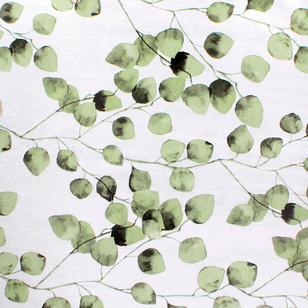 - Mantel Hule estampado en color gris con formas de hojas y ramas en verde. Diseño moderno y elegante para cualquier ocasión.