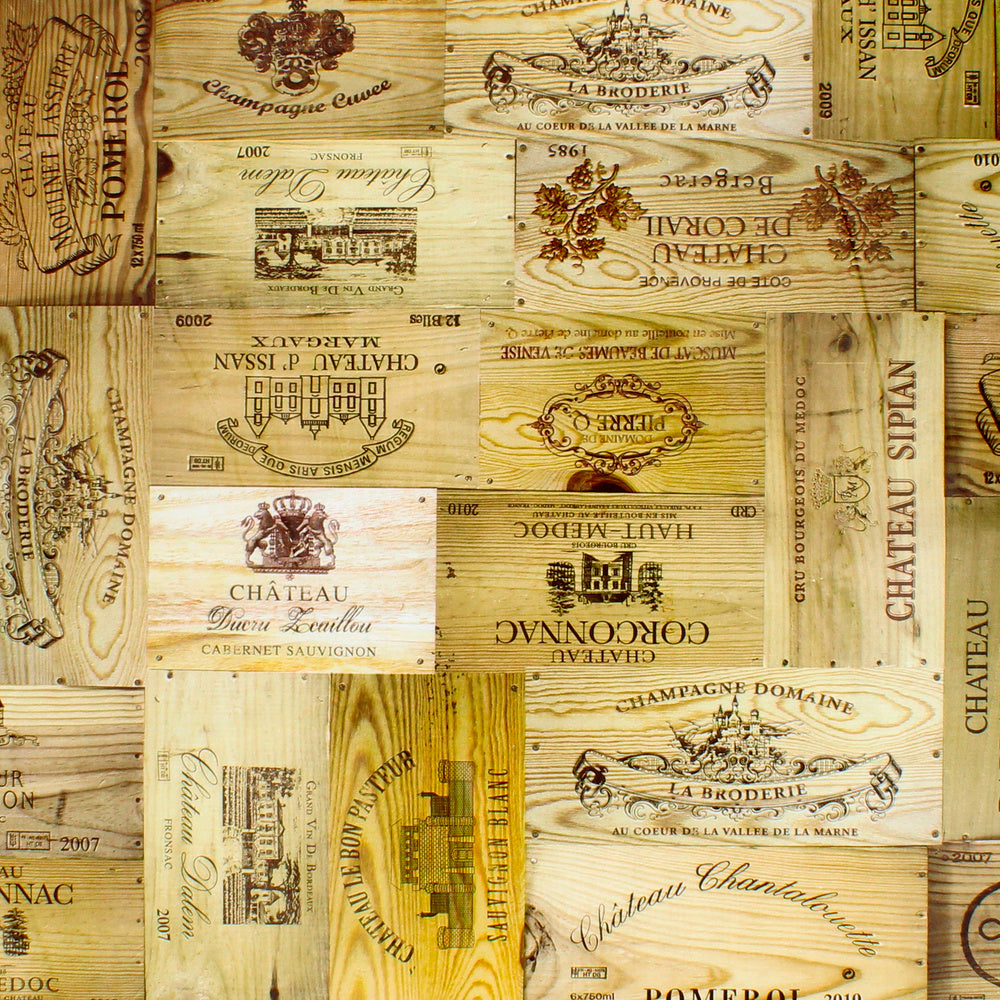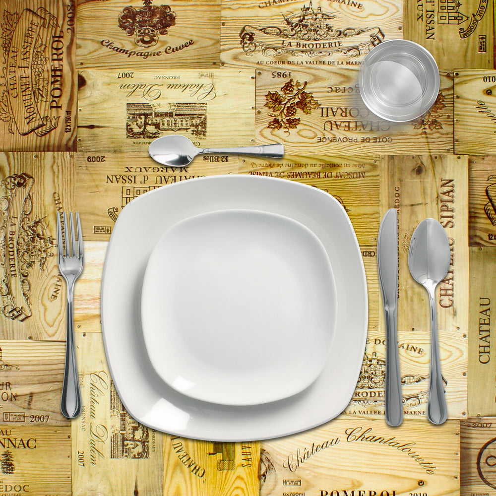 - Mantel Hule estampado en color madera imitando una composición cajas de vino. Diseño moderno y elegante para cualquier ocasión.