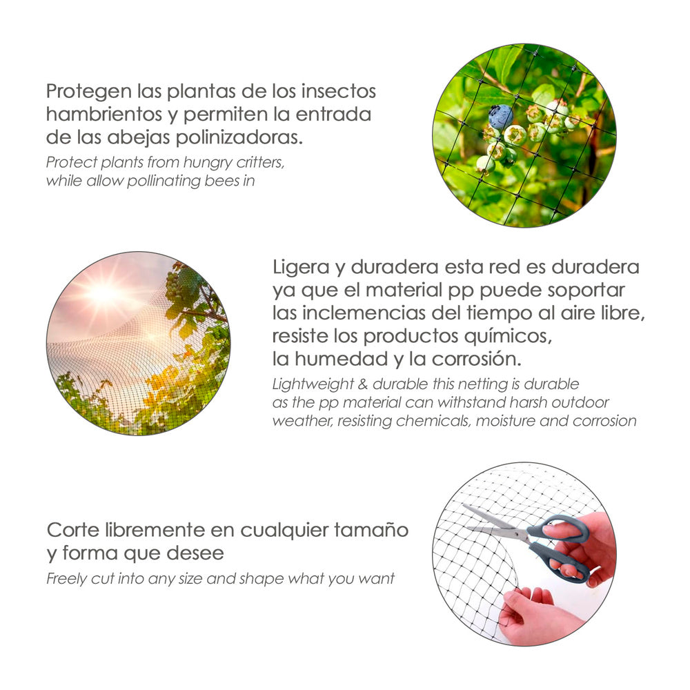 - Con un peso de 50 gramos/m2. esta malla destaca por su resistencia y ligereza, proporcionando una protección duradera.