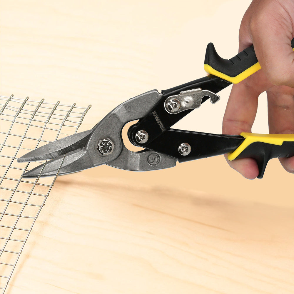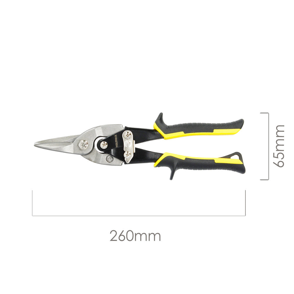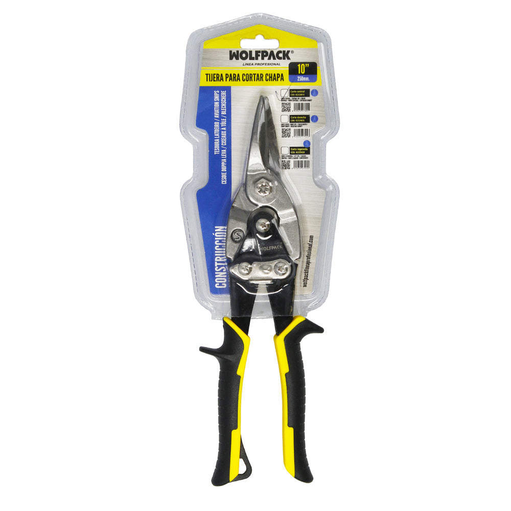 Tijeras chapa corte central 250 mm. hoja acero al carbono, mangos engomados, con dientes serrados, cortachapa, tijera aviacion