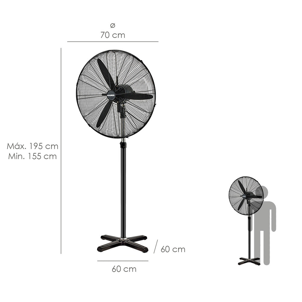 Ventilador pie ø 70 x195 cm. negro 190 w. oscilación automática, altura regulable, cabezal inclinable, base estable 60x60 cm