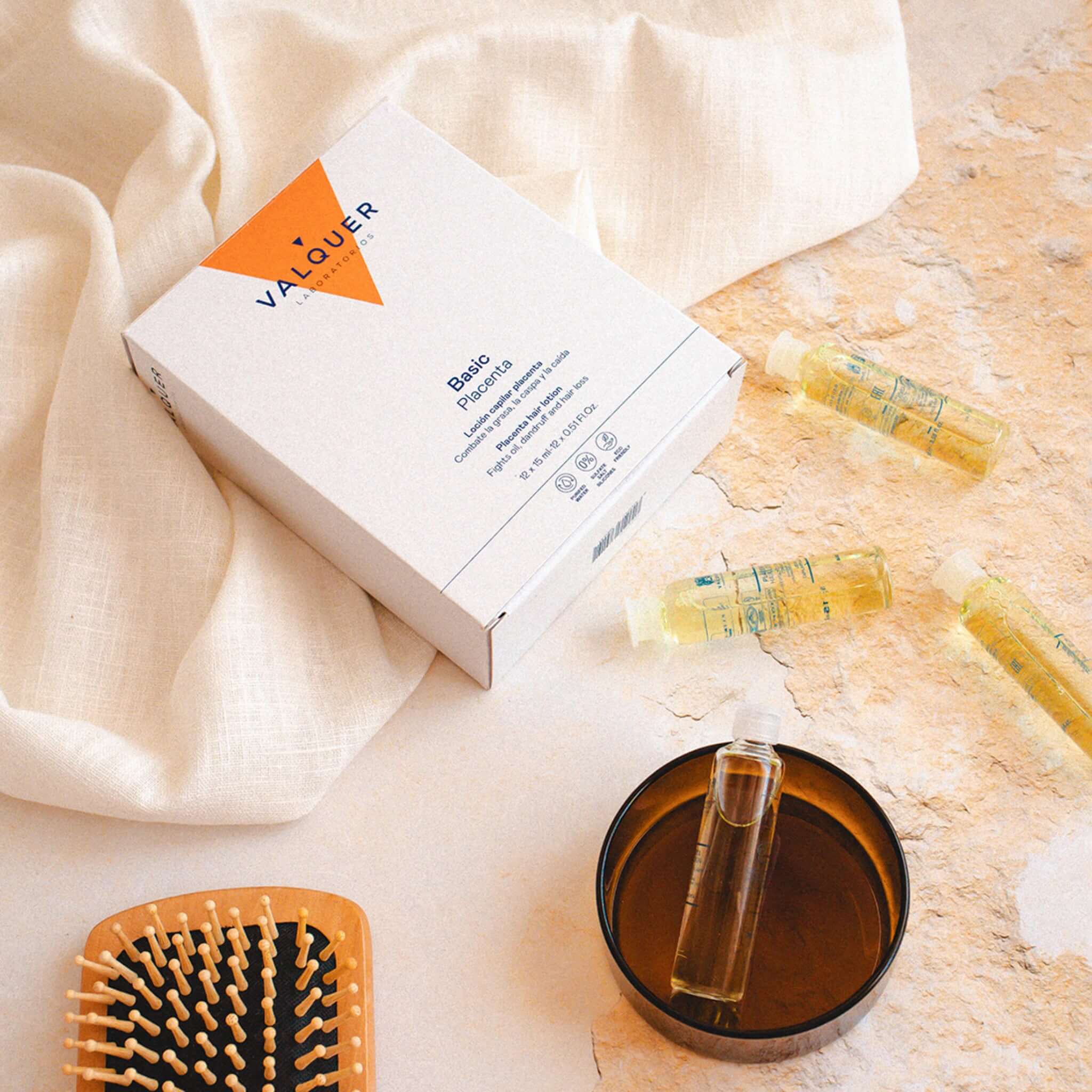 Loción capilar fortalecedora basada en placenta vegetal, presentada en ampollas de 15 ml. Tratamiento natural pensado para personas que buscan fortalecer el cabello y cuidar el cuero cabelludo.