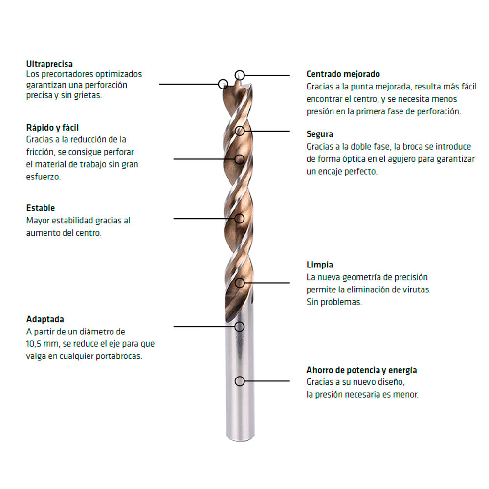 - Centrado mejorado: Gracias a la punta mejorada, resulta más fácil encontrar el centro, y se necesita menos presión en la primera fase de perforación.