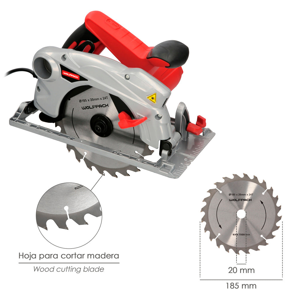 Sierra circular 1300 watt. con laser disco 185 mm. 4.700 RPM corte inglete regulador de profundidad. ingletadora, sierra madera