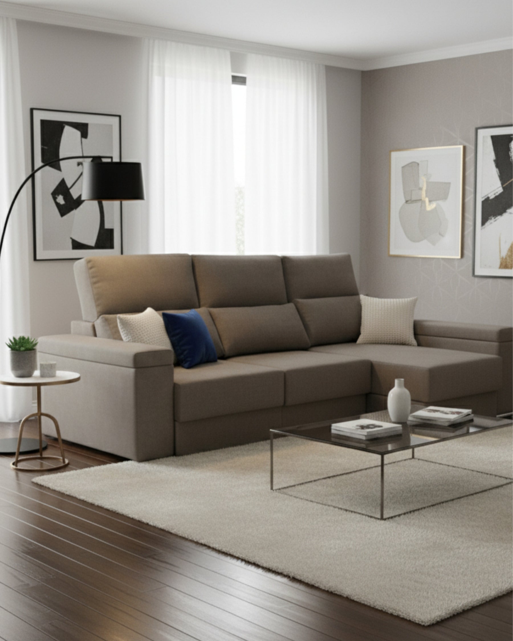 Es un sofá chaiselongue de 3 plazas en gris visón, tapizado en tela Salvador, pensado para salones que buscan confort envolvente y elegancia discreta. Su configuración a izquierda o derecha y sus brazos arcón aportan versatilidad y funcionalidad para el uso diario.