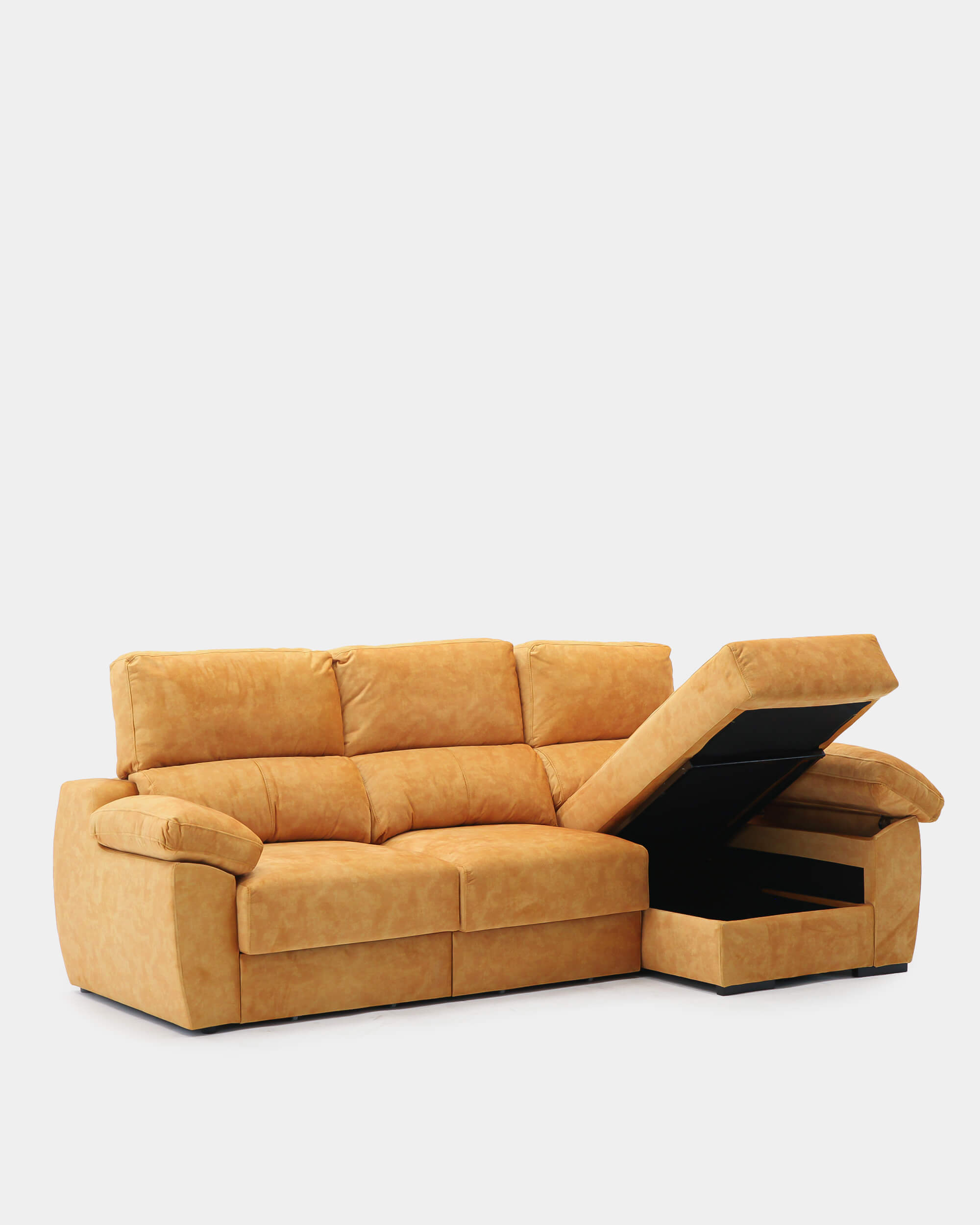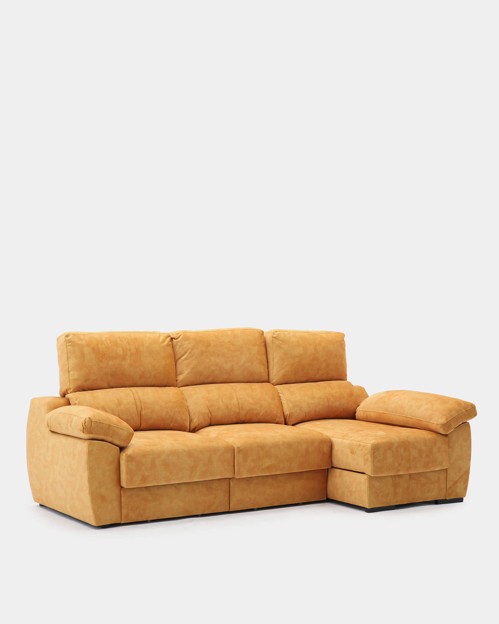 El sofá chaiselongue de 3 plazas, con 260 cm de ancho, ofrece un amplio espacio para compartir momentos en familia. Ideal para hogares que buscan confort, funcionalidad y un toque de color gracias a su tapizado antimanchas en amarillo.