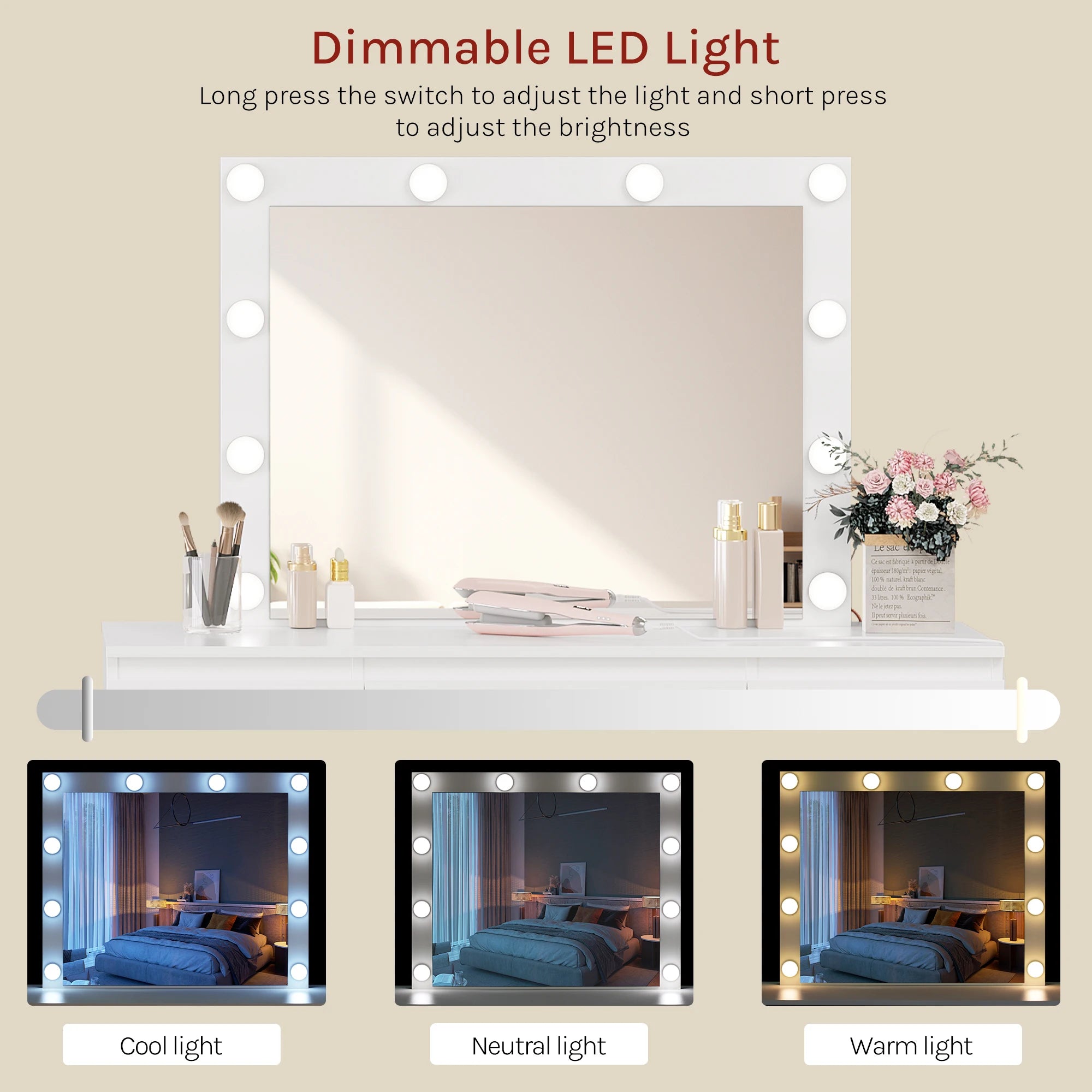 • La iluminación regulable del espejo facilita maquillar y peinar con claridad, ajustando temperatura de color para evitar sombras.
