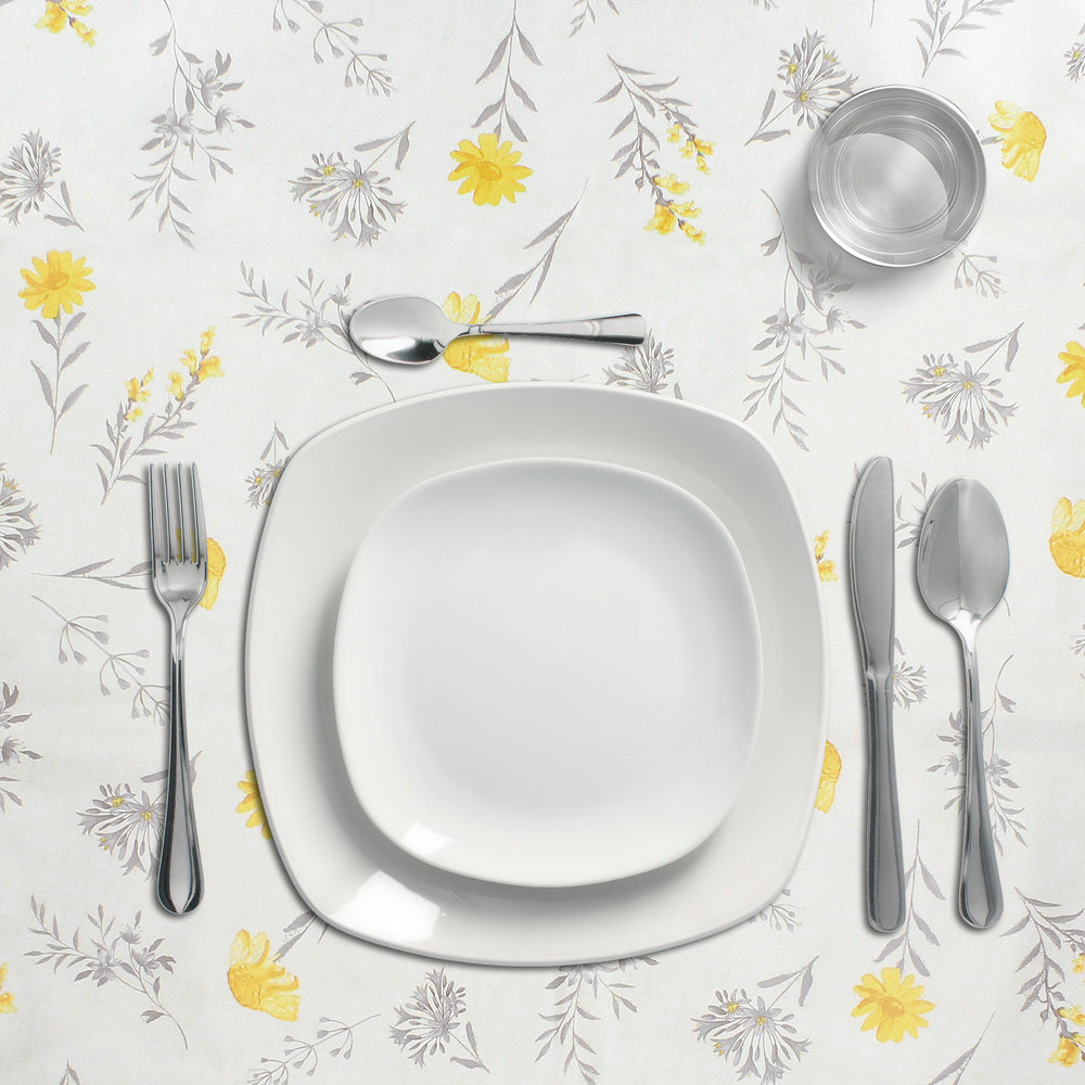 - Mantel Hule estampado en color gris con formas de flores amarillas. Diseño moderno y elegante para cualquier ocasión.