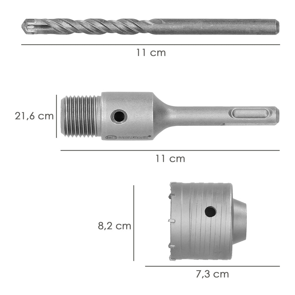 - Componentes: 1 sierra de corona, 1 portabrocas, 1 broca guía.