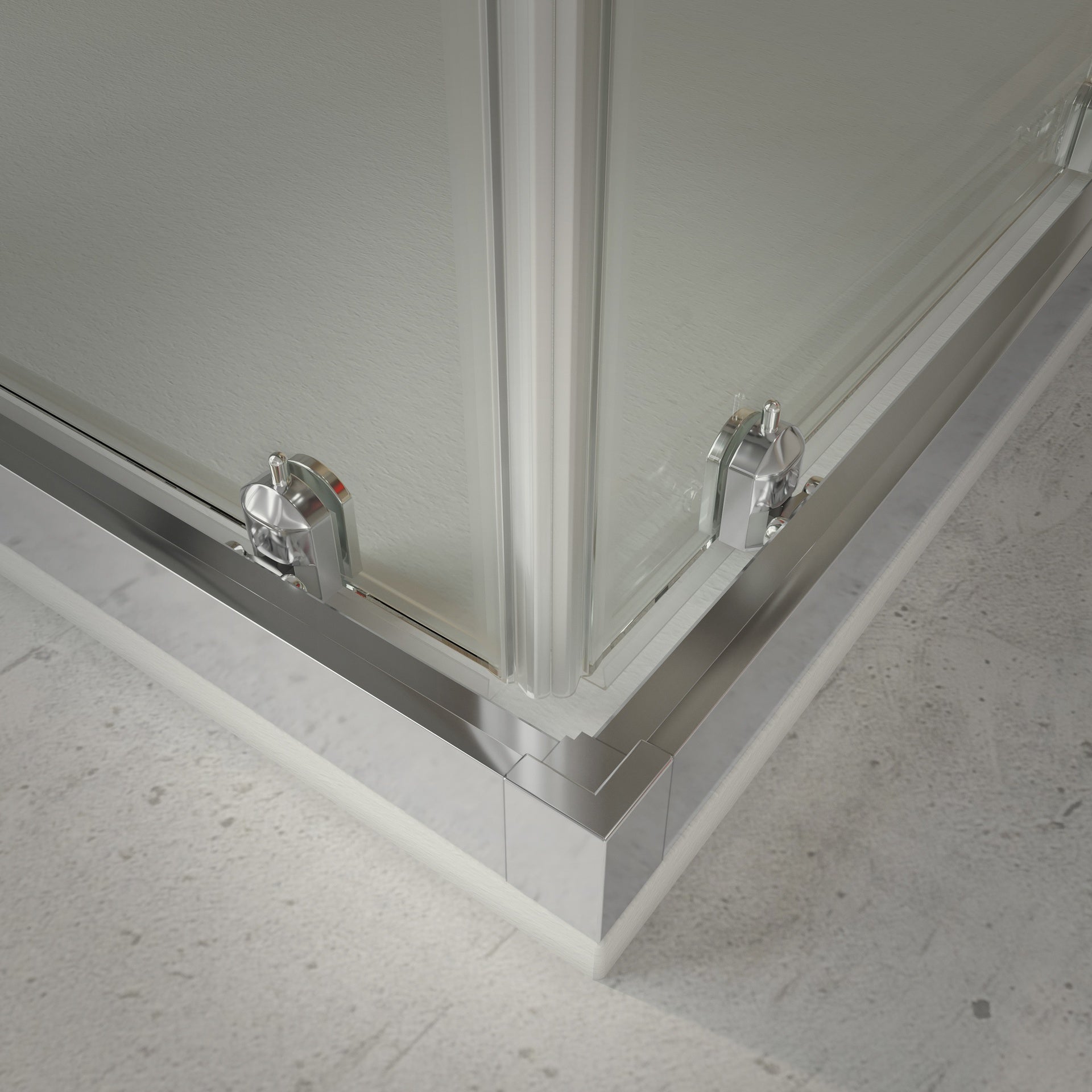 Mampara de ducha angular con acabado cromo brillo y vidrio transparente. Diseñada para baños modernos, ofrece durabilidad y un acceso cómodo gracias a sus puertas correderas y cierre magnético.