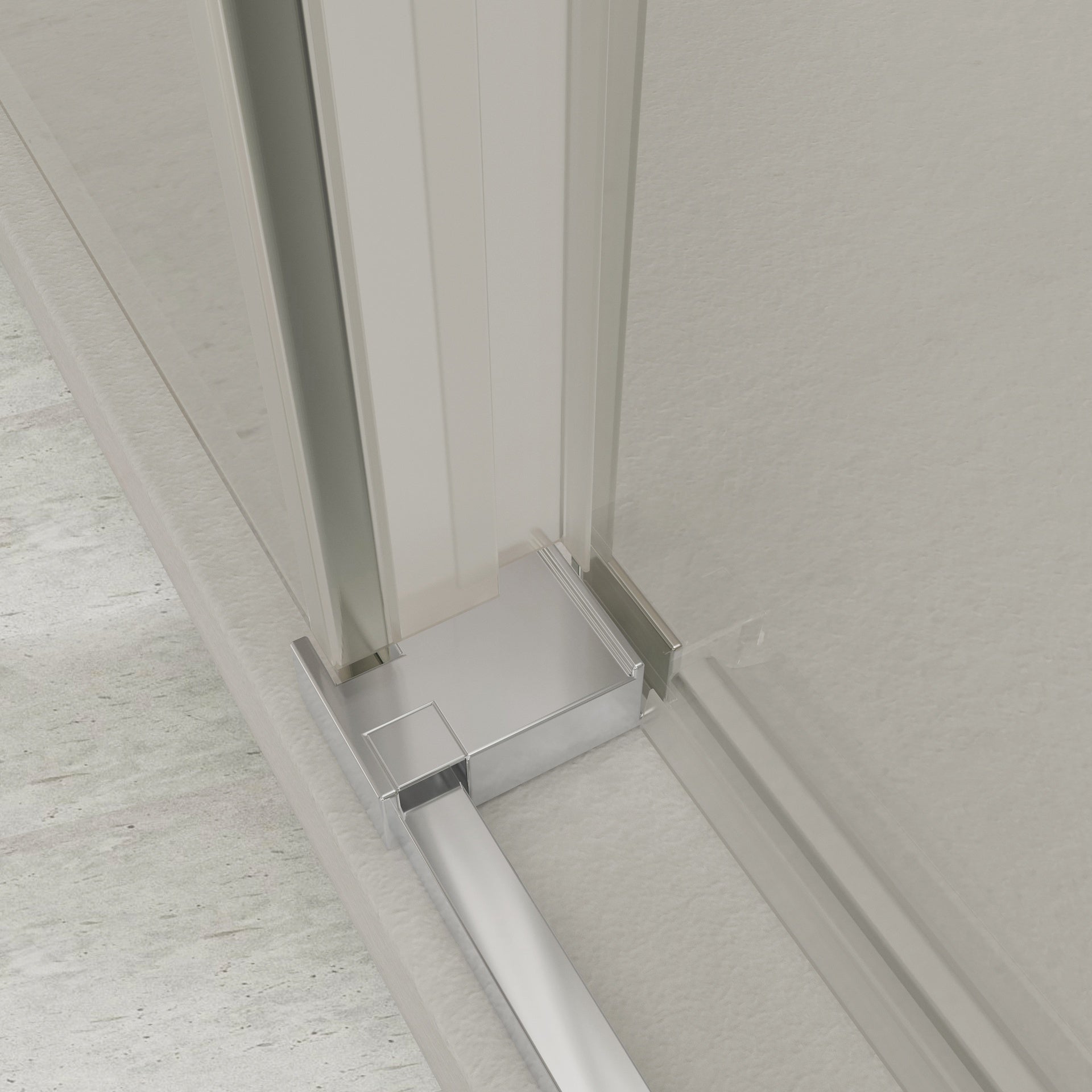 Es una mampara frontal para platos de ducha con diseño minimalista y SIN GUÍA INFERIOR para facilitar la limpieza. Ofrece una configuración con una hoja fija y una puerta corredera para un uso práctico y eficiente.