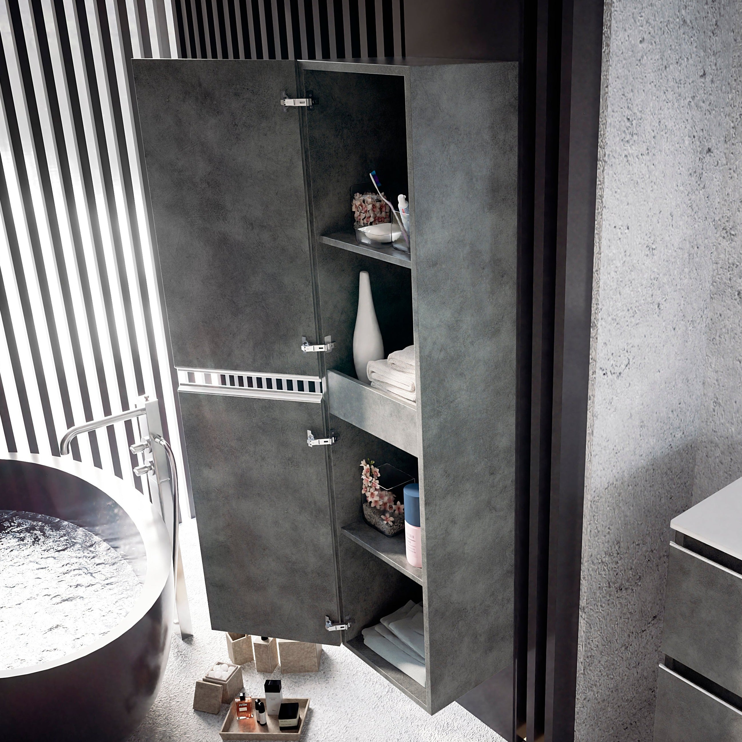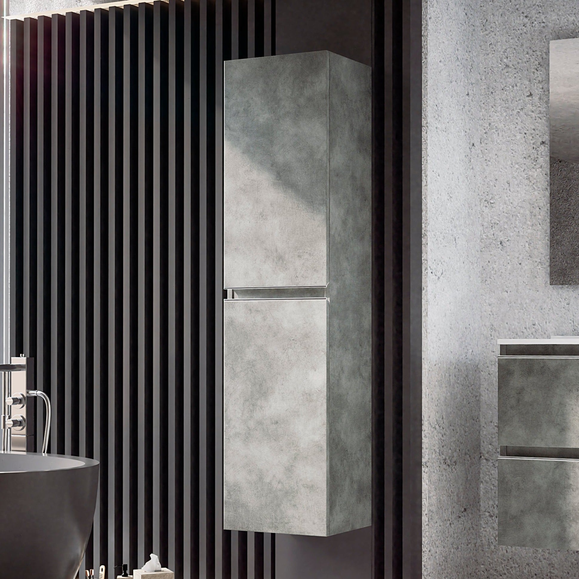 Pilar auxiliar para baño de la serie MADISON de Bathme. Ideal para baños que requieren gran capacidad de almacenamiento para utensilios y productos de aseo, con acabado cemento.