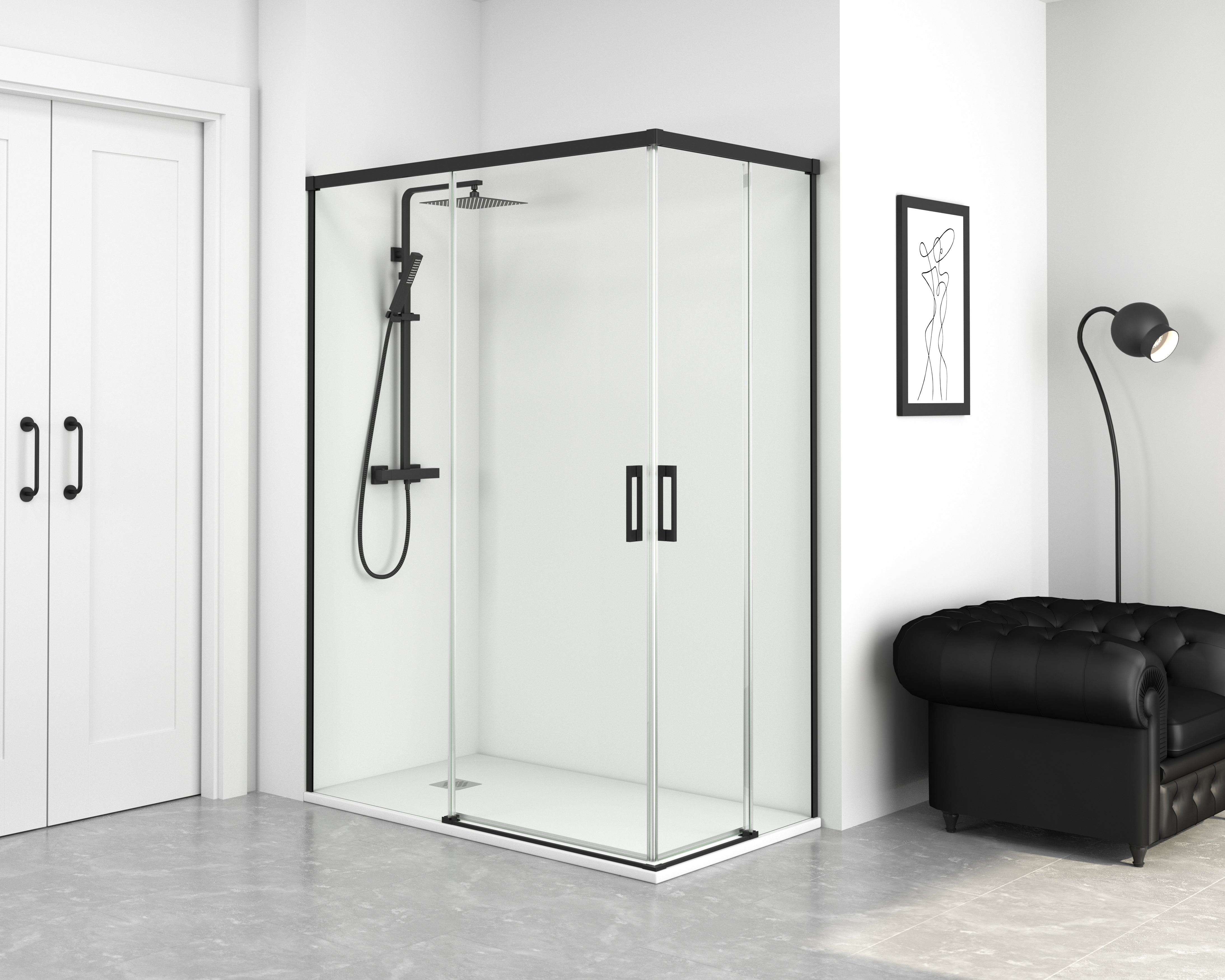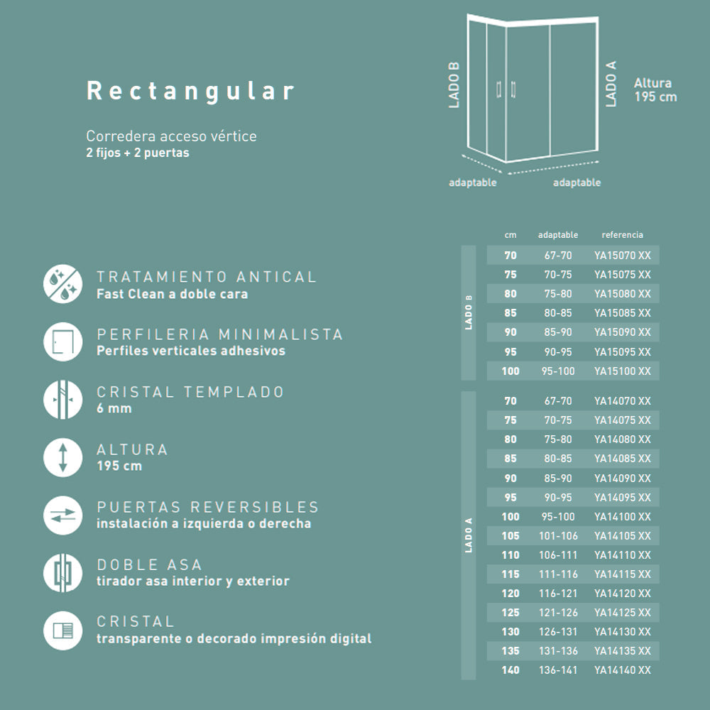 Mampara de ducha rectangular de la serie NIXON de Bathme. Ideal para platos de ducha rectangulares, incorpora dos hojas fijas y dos puertas correderas con apertura desde el vértice.