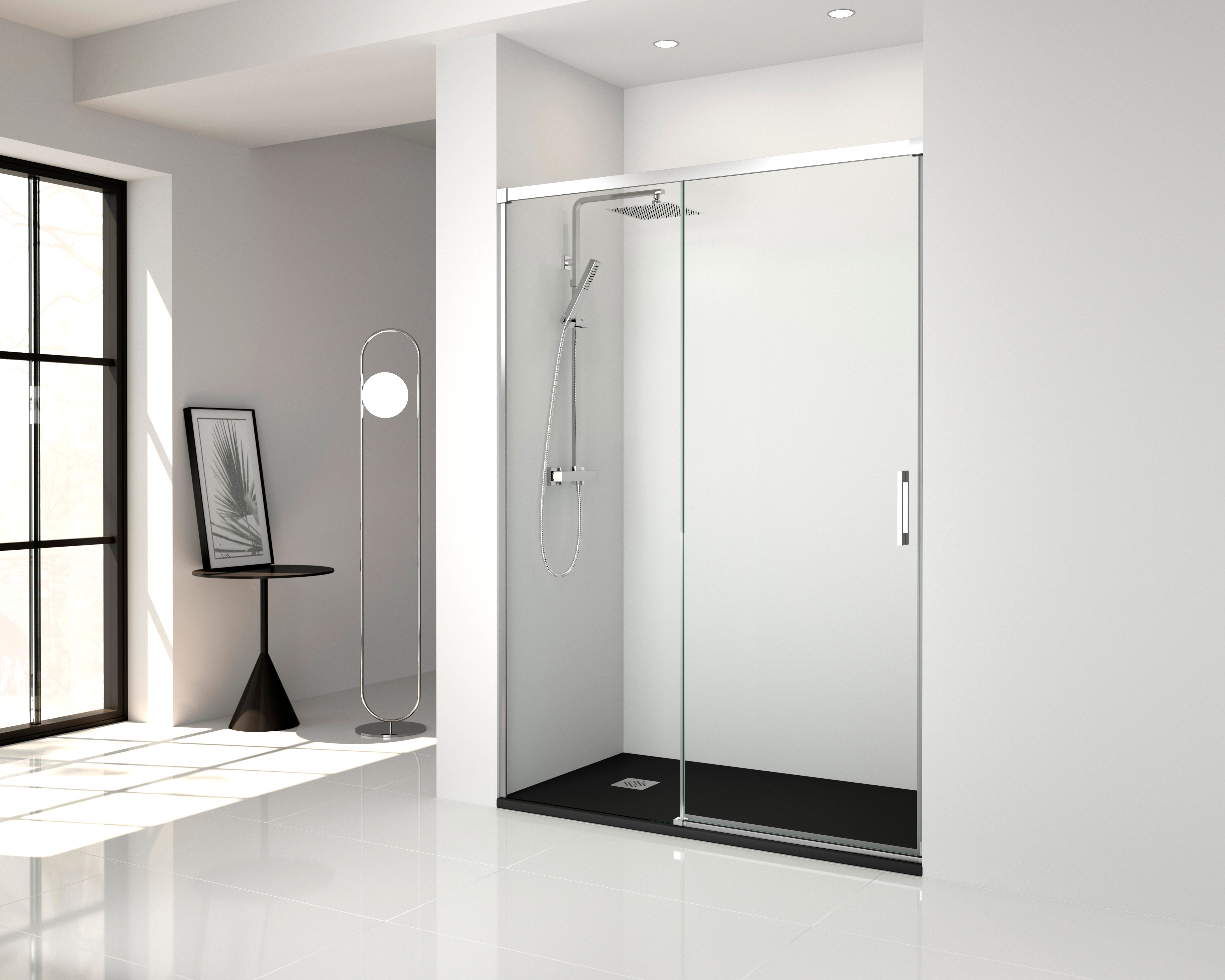 • Materiales: perfilería de aluminio con acabado cromado brillante; cristal templado de 6 mm con tratamiento antical incluido
