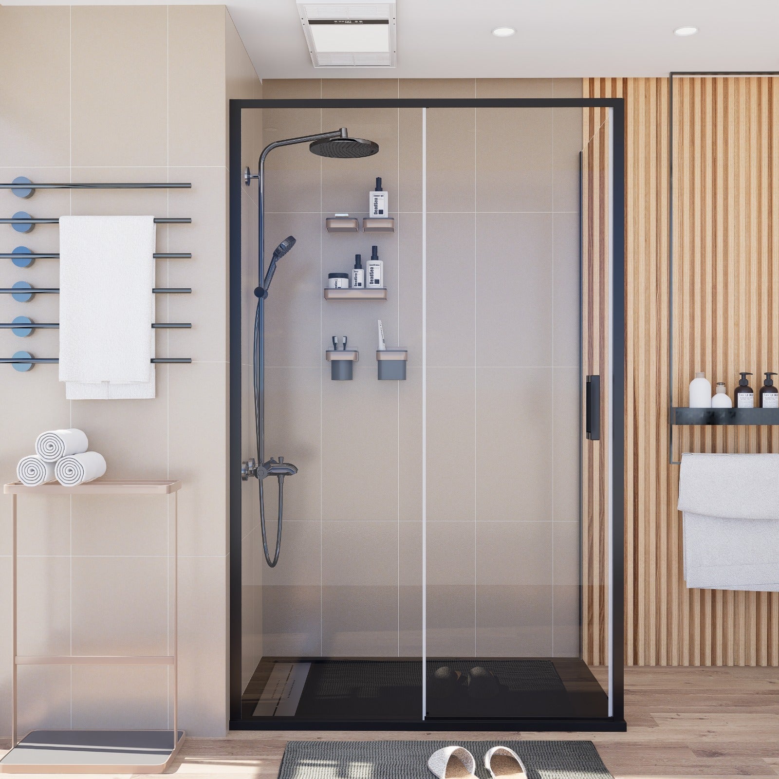 Mampara para plato de ducha de la serie NOEL de Bathme, diseñada para baños modernos que buscan estilo minimalista y limpieza fácil. Está formada por un lateral fijo y un frontal con puerta fija y puerta corredera, sin guía inferior para facilitar la limpieza.
